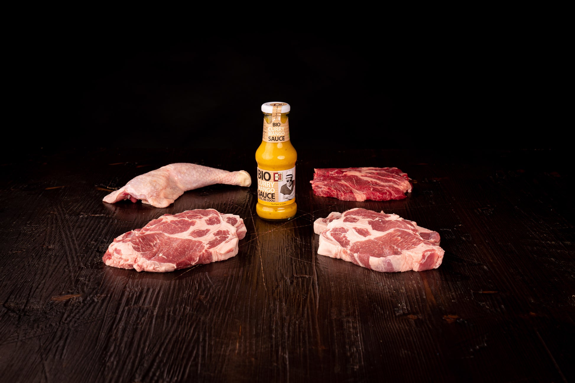 Mit unserem dritten Grillpaket triffst du fast jeden Geschmack am Grill: saftige Ochsenfetzen vom Rind, aromatischer Freiland-Bio Hähnchenschenkel und vier Stück Schweine-Halsgrat für den klassischen Grillgenuss – dazu eine BioART Bio-Sauce.